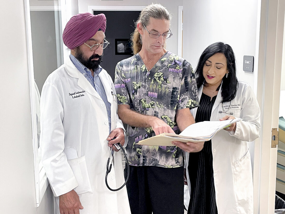 REVIEWING CHART –– Physicians review medical charts of patients, some of whom are malnourished. Patients seen at the clinic include those with no insurance or those underinsured. Reviewing the charts with the Nandras was Michael Hauber, clinical nurse manager. — Julie Stenger